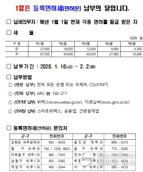 (케이엠뉴스) 인천광역시는 2026년 정기분 등록면허세(면허분) 396,262건, 총128억 원을 부과·고지했다고 밝혔다.