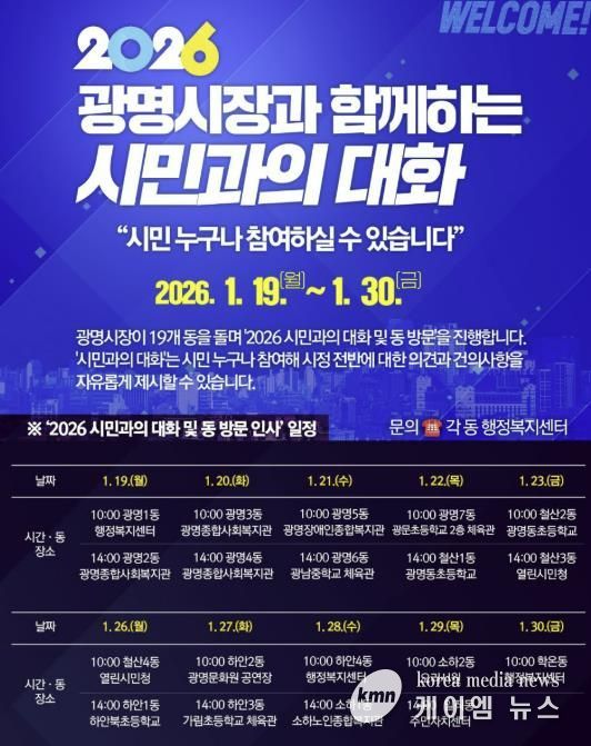 한편, 구체적인 방문 일정은 ▲19일 오전 10시 광명1동, 오후 2시 광명2동 ▲20일 오전 10시 광명3동, 오후 2시 광명4동 ▲21일 오전 10시 광명5동, 오후 2시 광명6동 ▲22일 오전 10시 광명7동, 오후 2시 철산1동 ▲23일 오전 10시 철산2동, 오후 2시 철산3동 ▲26일 오전 10시 철산4동, 오후2시 하안1동 ▲27일 오전 10시 하안2동, 오후 2시 하안3동 ▲28일 오전 10시 하안4동, 오후 2시 소하1동 ▲29일 오전 10시 소하2동, 오후 2시 일직동 ▲30일 오전 10시 학온동이다.