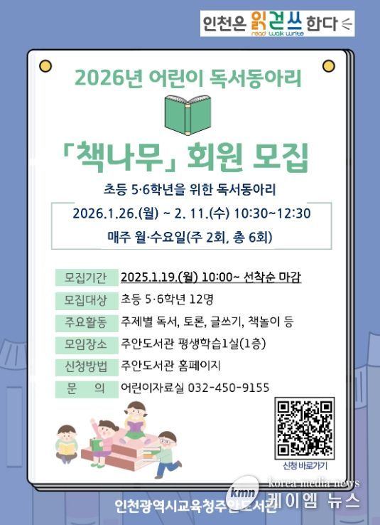 (케이엠뉴스) 인천광역시교육청주안도서관은 예비 초등 5·6학년 학생을 대상으로 하는 독서동아리 '책나무' 회원을 모집한다.