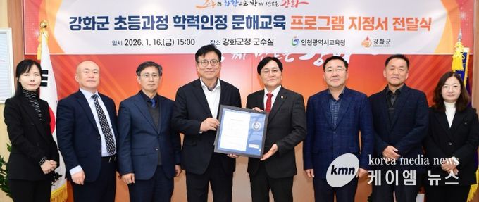 (케이엠뉴스) 인천광역시교육청은 강화군 내 저학력 성인의 기초학력 지원을 위해, 강화군청을 ‘초등 학력인정 문해교육 프로그램’ 운영기관으로 지정하고, 16일 지정서를 전달했다.