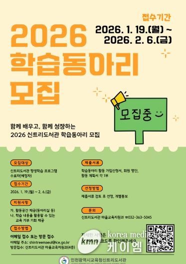 (케이엠뉴스) 인천광역시교육청신트리도서관은 지역주민의 자발적인 학습 문화 조성과 지속 가능한 마을 학습공동체 형성을 위해 2026년 학습동아리를 모집한다.