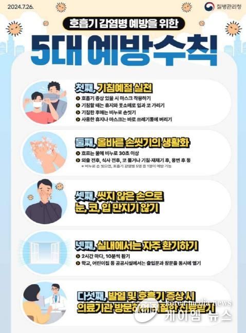 호흡기 감염병의 발생과 전파 예방을 위해서는 △ 접종 시기에 맞춰 예방접종 실시 △ 흐르는 물에 30초 이상 올바른 손씻기 △ 기침할 때 옷소매로 입과 코 가리기 △ 실내에서 자주 환기하기 △ 증상 발생 시 의료기관 방문해 진료받기 등 예방수칙을 준수하는 것이 중요하다.