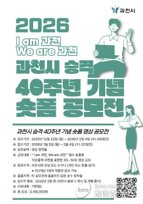 (케이엠뉴스) 과천시는 시 승격 40주년을 맞아 ‘숏폼 영상 공모전’을 개최하고, 오는 2월 4일까지 작품을 모집한다고 밝혔다.