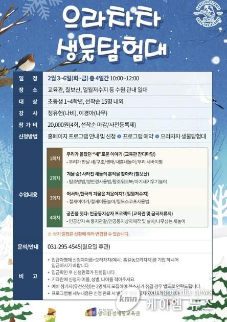 (케이엠뉴스) 칠보생태환경체험교육관이 겨울방학 프로그램 ‘으라차차 생물탐험대(겨울 탐조프로젝트)’에 참여할 초등학교 1~4학년 어린이 15명을 선착순으로 모집한다.