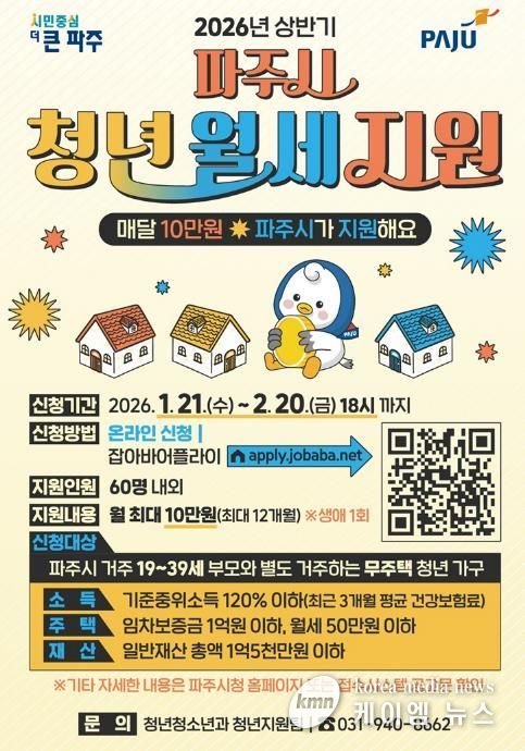 (케이엠뉴스) 파주시는 주거비 부담으로 어려움을 겪고 있는 19~39세 청년 가구를 대상으로 월 최대 10만 원씩 최대 12개월간, 총 120만 원의 월세를 지원한다.