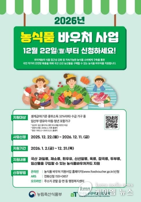 지원 대상 가구는 마트, 편의점, 로컬푸드 직매장 등 농식품바우처 카드 지정 사용처에서 농식품바우처 카드를 사용해 국산 채소, 과일, 육류, 잡곡, 두부, 흰 우유, 임산물 등 신선 농식품을 구매할 수 있다.