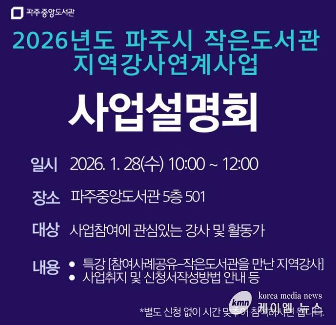 (케이엠뉴스) 파주시 중앙도서관은 지역의 작가, 예술가, 독서문화 활동가 등 인재를 발굴해 작은도서관의 독서문화 프로그램을 지원하는 녪년 작은도서관 지역강사 연계사업’에 참여할 지역강사를 모집한다.