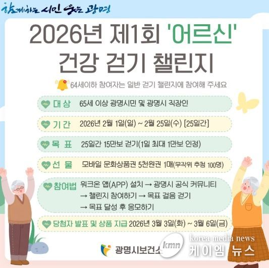 (케이엠뉴스) 광명시가 오는 2월부터 모바일 걷기 플랫폼 ‘워크온(WalkOn)’을 활용한 걷기 챌린지 방식을 개편하고, 65세 이상 시민을 위한 ‘어르신 걷기 챌린지’를 별도로 운영한다고 21일 밝혔다.