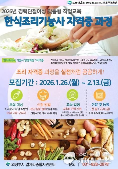 (케이엠뉴스) 의정부시는 경력단절여성의 안정적인 재취업을 지원하기 위해 ‘2026년 한식조리기능사 자격증 과정’ 참여자를 모집한다.