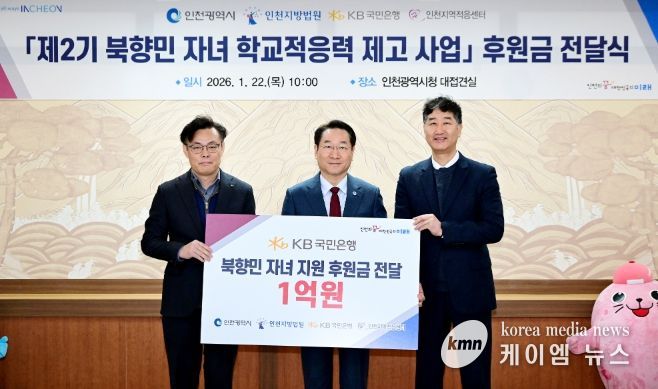 (케이엠뉴스) 인천광역시는 북향민 자녀의 학교 적응력 향상을 위한 '북향민 자녀 학교적응력 제고 제2기 사업' 추진을 위해 1월 22일 후원금 전달식을 개최하고, 국민은행으로부터 후원금 1억 원을 전달받았다고 밝혔다.