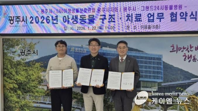 (케이엠뉴스) 광주시는 지난 22일 시청 이음홀에서 지역 내에서 발생하는 부상 야생동물의 신속한 구조와 치료를 위해 (사)야생생물보호연합 광주시지회 및 그랜드24시동물병원과 업무협약(MOU)을 체결했다.