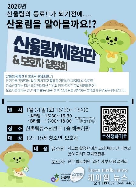 (케이엠뉴스) 부천여성청소년재단이 운영하는 산울림청소년센터는 오는 1월 31일, 2026년도 참여·자치기구 활동에 관심 있는 청소년과 보호자를 대상으로 ‘산울림 체험판 & 보호자 설명회’를 개최한다.