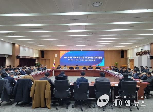 도는 23일 도청 대회의실에서 신일호 안전기획관 주재로, 도 관련 부서 및 시군 과장들이 참석한 가운데 ‘재해복구사업 조기 추진 대책회의’를 개최했다.