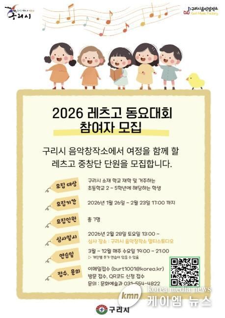 (케이엠뉴스) 구리시는 오는 3월부터 추진하는 'Let’s Go! 동요 대회' 사업에 참여할 학생을 2월 23일까지 모집한다고 밝혔다.