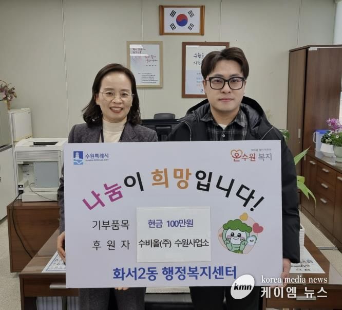 (케이엠뉴스) 수원시 팔달구 화서2동에 위치한 수비올㈜ 수원사업소는 설 명절을 앞두고 지난 26일 화서2동 행정복지센터를 방문해 지역 내 어려운 이웃을 돕기 위한 이웃돕기 성금 100만 원을 기탁했다.