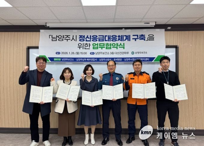 (케이엠뉴스) 남양주시는 지난 26일 남양주보건소 다산건강마루에서 자·타해 위험이 있는 정신응급 환자에 대한 신속하고 체계적인 대응체계를 구축하기 위해 관계기관과 ‘남양주시 정신응급대응체계 구축 업무협약’을 체결했다고 27일 밝혔다.