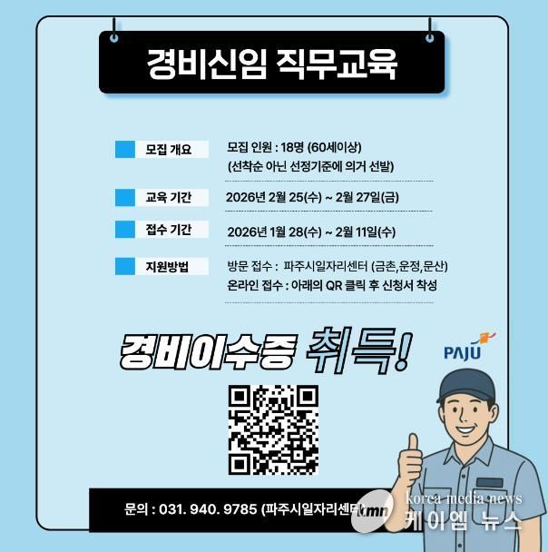 (케이엠뉴스) 파주시는 경비 분야 취업을 희망하는 시민을 대상으로 ‘경비 신임 직무교육’참여자 18명을 모집한다.