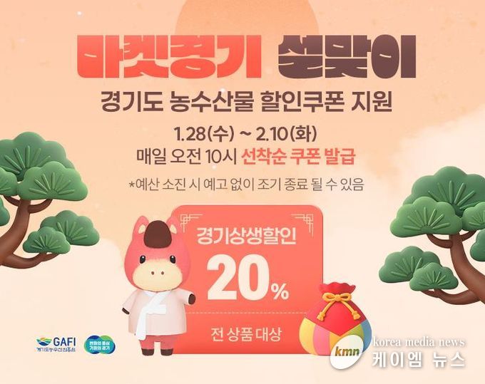 (케이엠뉴스) 매일 오전 10시 경기도 농수축산물 온라인쇼핑몰 ‘마켓경기’를 방문하면 경기미, 농수축산물, 가공식품 등 모든 상품을 20% 할인가에 구매할 수 있는 ‘2026 설맞이 할인쿠폰’이 선착순 지급된다.