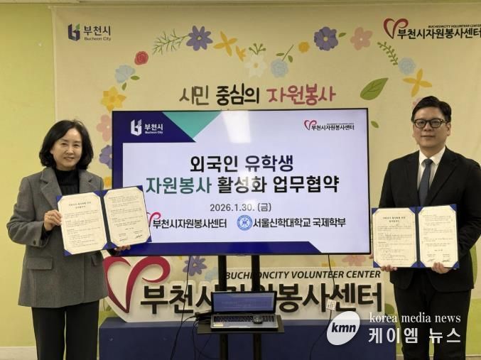(케이엠뉴스) 부천시는 부천시자원봉사센터가 지난 1월 30일 서울신학대학교 국제학부와 ‘해외 유학생 자원봉사 활성화’를 위한 업무협약을 체결했다고 2일 밝혔다. 이번 협약은 관내 외국인 유학생의 지역사회 참여를 넓히고, 자원봉사를 통해 안정적인 지역 정착을 돕기 위해 추진됐다.