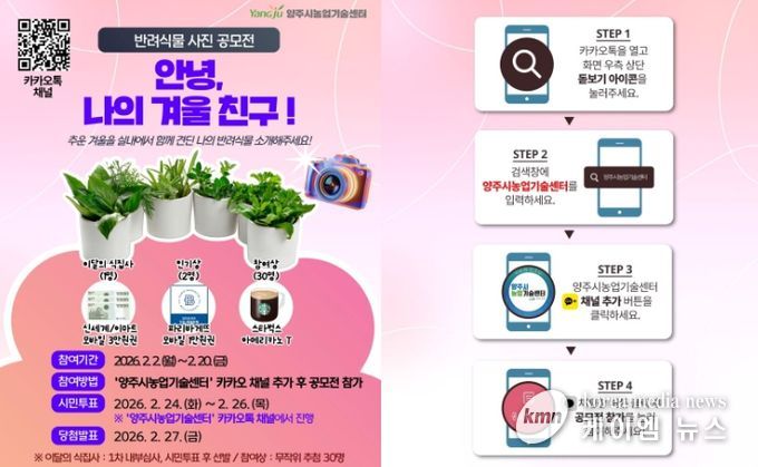 (케이엠뉴스) 양주시가 시민들과의 소통을 강화하고 도심 속 녹색 생활 실천 문화를 조성하기 위해 2월 2일부터 ‘2026년 반려식물 사진 공모전’을 개최한다.