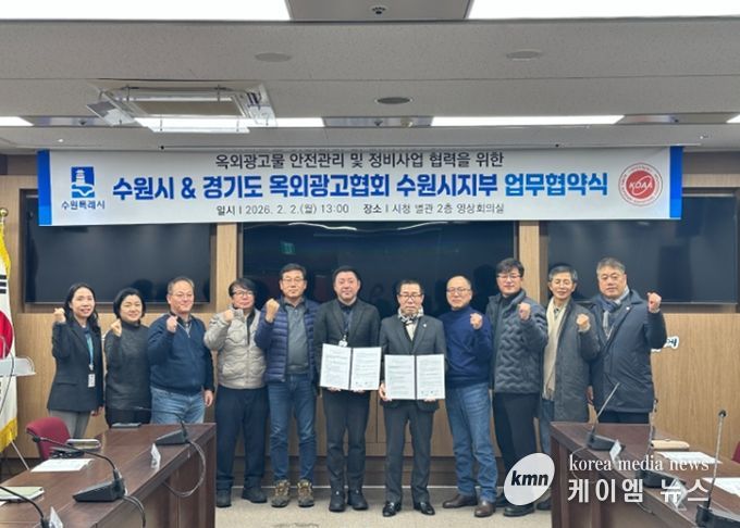 (케이엠뉴스) 수원특례시와 경기도 옥외광고협회 수원시지부가 2일 시청 영상회의실에서 ‘옥외광고물 안전관리 강화를 위한 업무협약’을 체결하고, 협력을 약속했다.