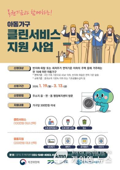 (케이엠뉴스) 경기도에서 열악한 주거환경에 거주하는 아동가구들을 위한 ‘아동가구 클린서비스 지원 사업’을 복권기금과 함께 추진한다.