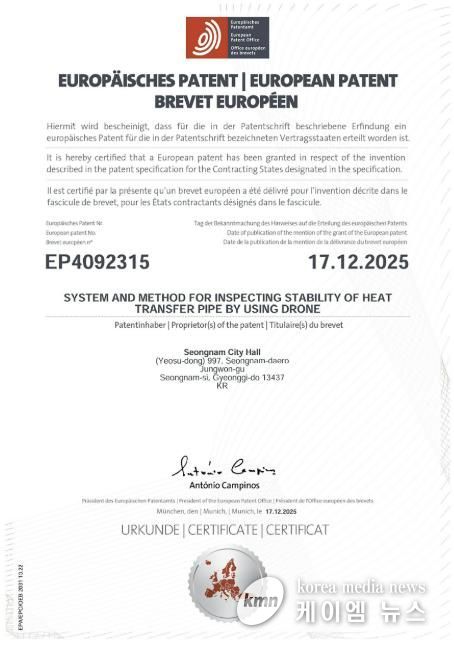 (케이엠뉴스) 성남시가 자체 개발한 ‘드론을 이용한 열수송관 안정성 검사 시스템’이 유럽특허(등록번호 EP4092315) 등록을 완료했다고 밝혔다. 이는 시 최초의 해외특허 등록 사례로, 지식재산의 해외 권리화를 통해 유럽 수출길을 여는 계기가 될 것으로 기대된다.