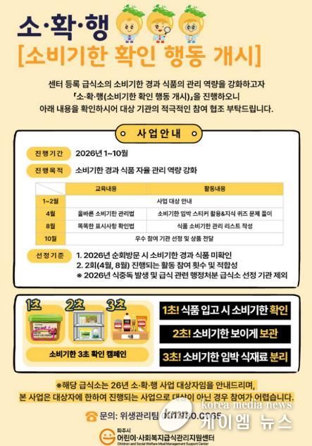 이번 사업은 센터 등록 급식소가 소비기한 경과 여부를 자율적으로 점검하고 관리할 수 있도록 지원하는 프로그램이다. 2026년에는 ‘소비기한 3초 확인 캠페인’을 운영해 상시적인 소비기한 관리를 유도하고 대상별 맞춤형 사업 운영을 통한 소비기한 경과 식품 확인 급식소 감소를 목표로 한다.