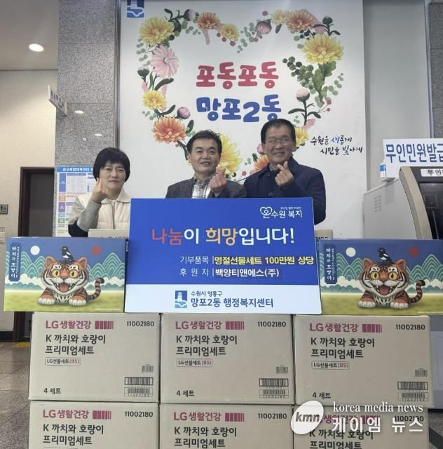 (케이엠뉴스) 영통구 망포2동 행정복지센터는 지난 3일 백양티앤에스(주)가 설 명절을 맞아 100만 원 상당의 명절 선물세트를 망포2동 취약계층을 위해 기탁했다고 밝혔다.