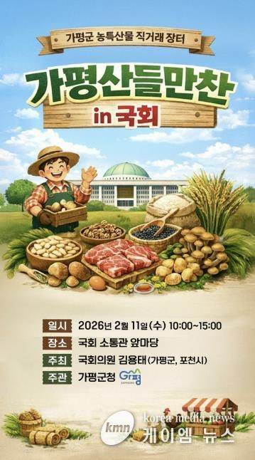 (케이엠뉴스) 설 명절을 앞두고 가평군의 우수 농특산물을 한자리에서 만날 수 있는 직거래 장터가 국회에서 열린다. 소비자와 생산자를 직접 연결하는 이번 행사는 도시민들에게 가평 농산물의 우수성과 가평의 관광자원까지 함께 알리는 자리가 될 전망이다.