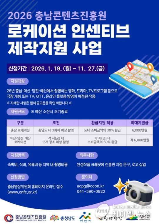 (케이엠뉴스) 충남콘텐츠진흥원이 추진하는 ‘충남·당진·아산·예산 로케이션 인센티브 지원사업’이 영상산업계의 주목을 받고 있다.