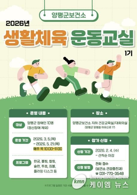 (케이엠뉴스) 양평군은 관내 등록 장애인을 대상으로 ‘2026년 장애인 생활체육 운동교실(1기)’ 참여자를 모집한다고 밝혔다.