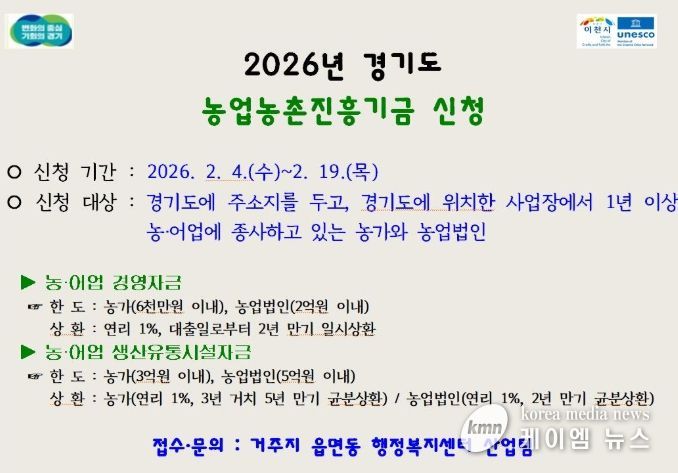 (케이엠뉴스) 이천시는 농업인에게 장기·저리 융자 지원을 실시하고 경영안정을 돕기 위해 2026년 경기도 농업농촌진흥기금 농어업 경영자금, 농어업 생산유통시설자금 사업에 대한 신청을 2월 3일부터 접수한다.