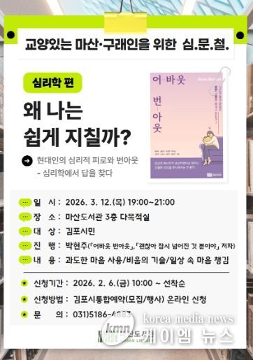(케이엠뉴스) 김포시 마산도서관은 심리적 피로와 번아웃을 주제로 한 인문교양 강연 '왜 나는 쉽게 지칠까?'를 오는 3월 12일 오후 7시부터 9시까지 마산도서관 3층 다목적실에서 운영한다.