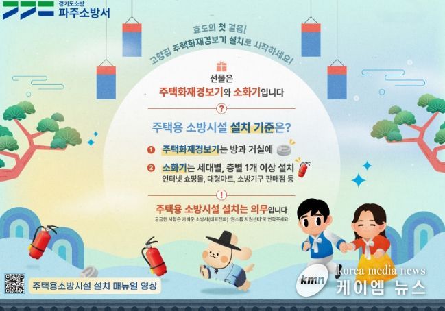 (케이엠뉴스) 파주소방서는 설 명절을 맞아 ‘주택용 소방시설 설치하기’ 홍보를 집중 추진하고 있으며, 최근 파주시에서 시민이 소화기를 활용하여 화재를 자체 진화한 사례가 발생해 주택용 소방시설의 중요성이 다시금 주목받고 있다.