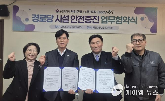 (케이엠뉴스) 용인특례시 처인구는 5일 처인구청 2층 소회의실에서 지역내 전기부품 생산 전문기업 ㈜두원과 ‘경로당 시설 안전증진 업무협약’을 체결했다.
