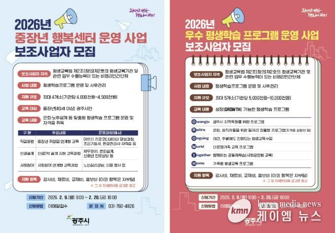 이번 공개모집은 ▲중장년 행복센터 운영사업 ▲우수 평생학습 프로그램 지원사업 등 2개 사업을 대상으로 한다. 모집 기간은 2월 9일부터 20일까지이며 신청 대상은 비영리 법인·단체와 학교 등이다.