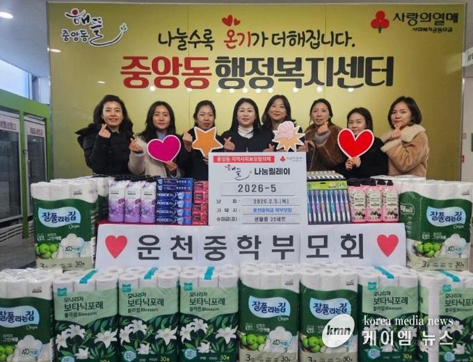 백경희 중앙동장은 “지역사회를 위해 이웃사랑을 실천해 주신 운천중학교 학부모회에 깊이 감사드린다”며 “기탁해 주신 물품은 정성 어린 마음을 담아 도움이 필요한 어르신들께 소중히 전달하겠다”고 밝혔다.
