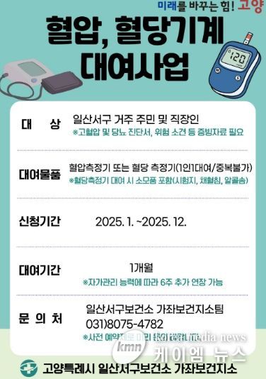 (케이엠뉴스) 고양특례시 일산서구보건소 가좌보건지소는 일산서구 주민들 중 고혈압, 당뇨 유질환자이거나 전 단계 소견을 받은 주민들을 대상으로 혈압·혈당계 대여사업을 진행한다고 밝혔다.