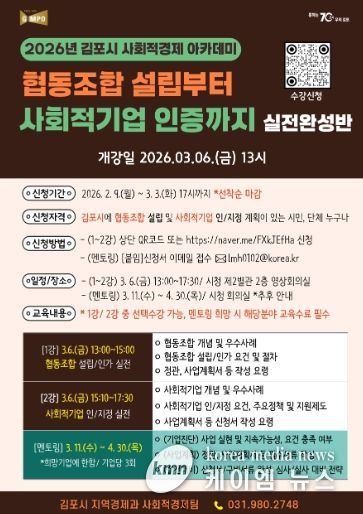 (케이엠뉴스) 김포시가 사회문제 해결을 위한 참신한 아이디어와 실행력을 갖춘 사회적경제기업 육성을 위해 ‘2026년 김포시 사회적경제 아카데미’를 개설하고, 오는 3월 3일까지 수강생을 모집한다.