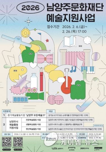 (케이엠뉴스) 남양주시는 6일 남양주문화재단이 지역 예술인의 안정적인 창작 환경 조성과 시민 문화향유 기회 확대를 위해 ‘2026년 예술활동 지원사업 공모’를 추진하고, 오는 26일까지 접수를 진행한다고 밝혔다.
