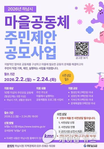 (케이엠뉴스) 하남시는 오는 2월 24일까지 ‘2026년 하남시 마을공동체 주민제안 공모사업’에 참여할 주민모임 공동체를 모집한다.