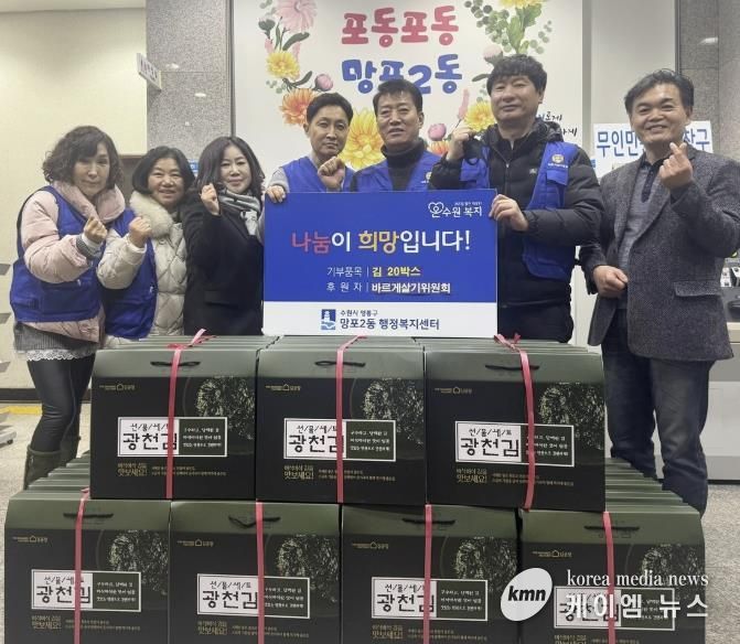 (케이엠뉴스) 영통구 망포2동 행정복지센터는 지난 6일 망포2동 바르게살기위원회가 관내 저소득 가정을 지원하기 위해 김 20박스를 기탁했다고 밝혔다.