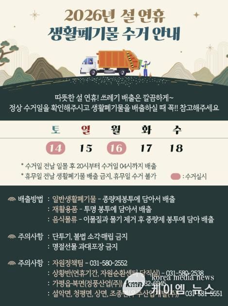 (케이엠뉴스) 가평군은 설 명절을 맞아 군민과 방문객 모두가 쾌적한 환경에서 청결한 연휴를 보낼 수 있도록 생활폐기물 처리 대책을 마련했다.