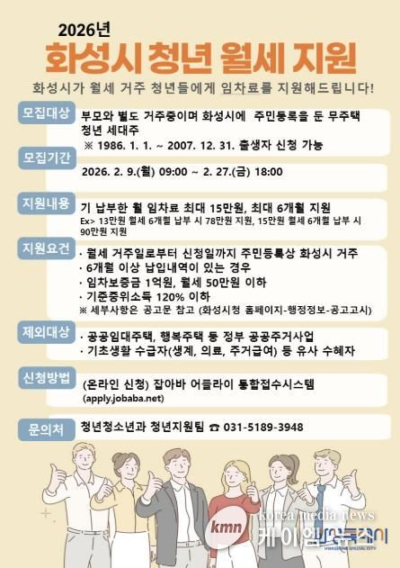 (케이엠뉴스) 화성특례시가 청년들의 주거비 부담을 덜고 안정적인 주거 생활을 지원하기 위해 2월 9일부터 2월 27일까지‘청년 월세 지원 사업’ 신청자를 모집한다고 밝혔다.