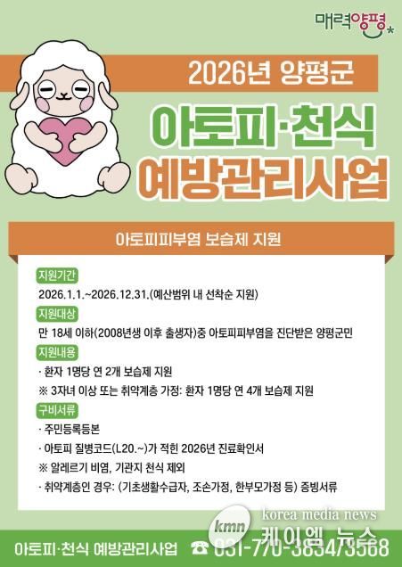 (케이엠뉴스) 양평군은 지역사회 중심의 알레르기질환 조기 발견과 적절한 치료를 위해 양평군민을 대상으로 2026년 연중 ‘아토피피부염 보습제 지원’과 ‘취약계층 알레르기질환 의료비 지원’ 사업을 추진한다고 밝혔다.