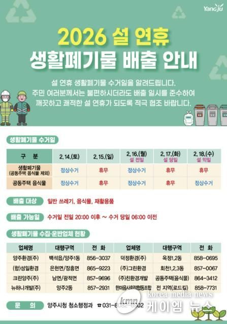 (케이엠뉴스) 양주시가 설 연휴 기간 시민과 방문객의 불편을 줄이기 위해 ‘2026년 설 연휴 생활폐기물 관리 대책’을 추진한다.