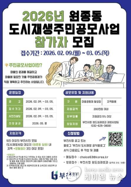 (케이엠뉴스) 부천시는 2월 9일부터 3월 5일까지 도시재생에 대한 주민 이해도를 높이고, 주민 주도의 사업 추진 역량을 강화해 지역 활성화와 공동체 발굴 등 주민 참여를 확대하고자 ‘원종동 도시재생 주민공모사업’ 참가자를 모집한다.