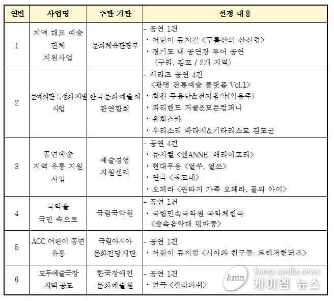 이번에 선정된 사업은 ▲지역 대표예술단체 지원 사업(문화체육관광부) ▲문예회관 특성화 지원 사업(한국문화예술회관연합회) ▲공연예술 지역 유통 지원 사업(예술경영지원센터) ▲지역 문화향유기회 확대를 위한 '국악을 국민 속으로'(국립국악원) ▲ACC 어린이 공연 유통(국립아시아문화전당재단) ▲모두예술극장 지역 공연 공모(한국장애인문화예술원)이다.