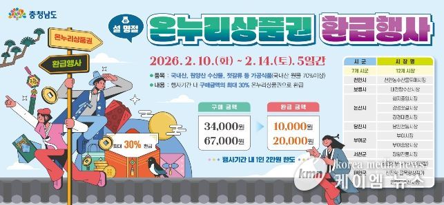 (케이엠뉴스) 충남도는 설 명절을 맞아 10일부터 14일까지 도내 7개 시군 12개 전통시장(연합포함 13개)에서 ‘온누리상품권 환급행사’를 실시한다.